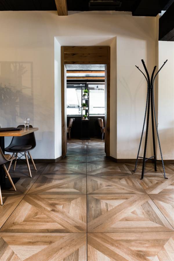 The BOLERO restaurant is a renovation project of a classic restaurant from the 90s. «With the renovation, I wanted to change the entire character of the restaurant to a more modern one, as the owner’s wish was to change the entire food offer to a higher - restaurant level. Due to the infrequentness of the industrial style in our environment (Slovenia), I chose this one because it is a bit more robust and of course I immediately noticed the collections at REFIN that helped me create the desired ambience. The main elements used throughout the restaurant are wood, which gives the appearance of warmth (ceramics in imitation wood) and metal, which gives robustness. For the feeling of comfort of the guest, decorative pots with greenery help. The ambience has thus become pleasant and private, as darker materials are used, which emphasize the concreteness and power of the industrial style, and at the same time, with the correct placement of the lights, I came to the right lighting of the space and details in it.»