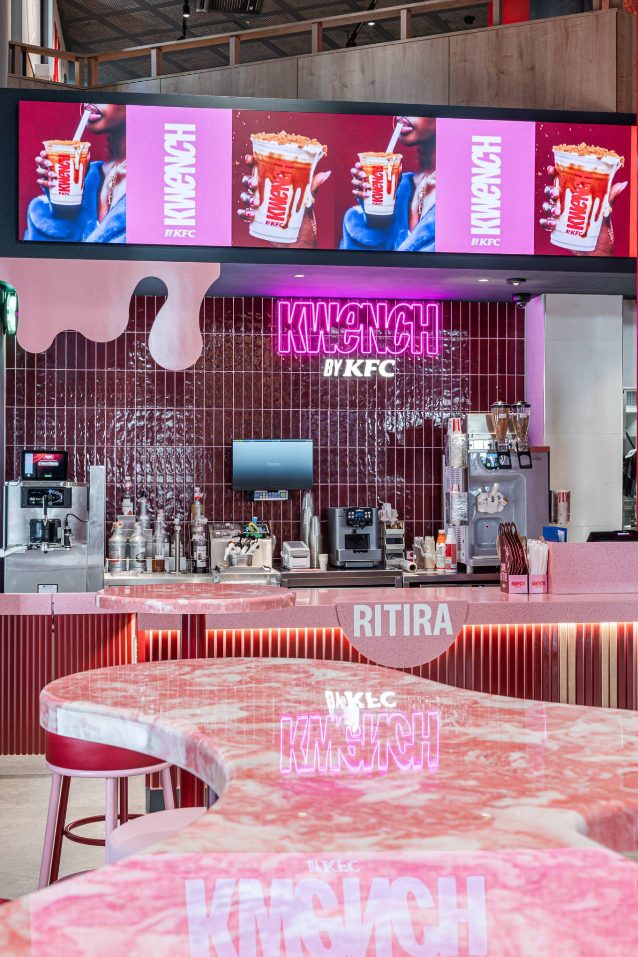 Beat se complementa con la colección Mold en color Iron, utilizada en las paredes del área de entrega y para crear el gran elemento circular de contraste que caracteriza el pavimento del “Bucket” tridimensional, diseñado para definir la zona de pedido.